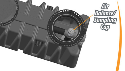 With removal of the downstream access cover, the sample port/air balance cap provides direct access to the effluent stream for water quality sampling. This removes the need for additional sampling ports downstream. (Subject to local code requirements). As an air balance device, this cap is essential to the operation of the interceptor maintaining the balance of air pressure within the unit to prevent build-up of positive pressure that can lead to discharge of tank contents. This cap is available as a replacement part. The XL DOES NOT typically require a separate sampling location. For those jurisdictions that do require the capability to sample, Drain-Net XL incorporates a sampling port within the outlet assembly (sampling well found here.) This is accessed by the simple removal of the air balance/sample port cap allowing water quality samples to be taken for analysis.