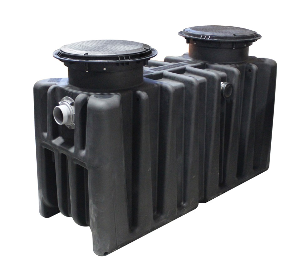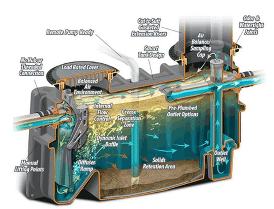 Comparable operational grease capacity (1058 lb) to 1500 gallon Gravity GI (Concrete).* Operation based on Dynamic Inlet Baffle (Pat. Pend.) with internal flow control device. Smart tank design offers many features, with external flow control available as an option. Cut-to-length riser system for burial up to 72”, pre-plumbed outlet system, traffic rated dual cover format for unrivalled maintenance accessibility & inspection.