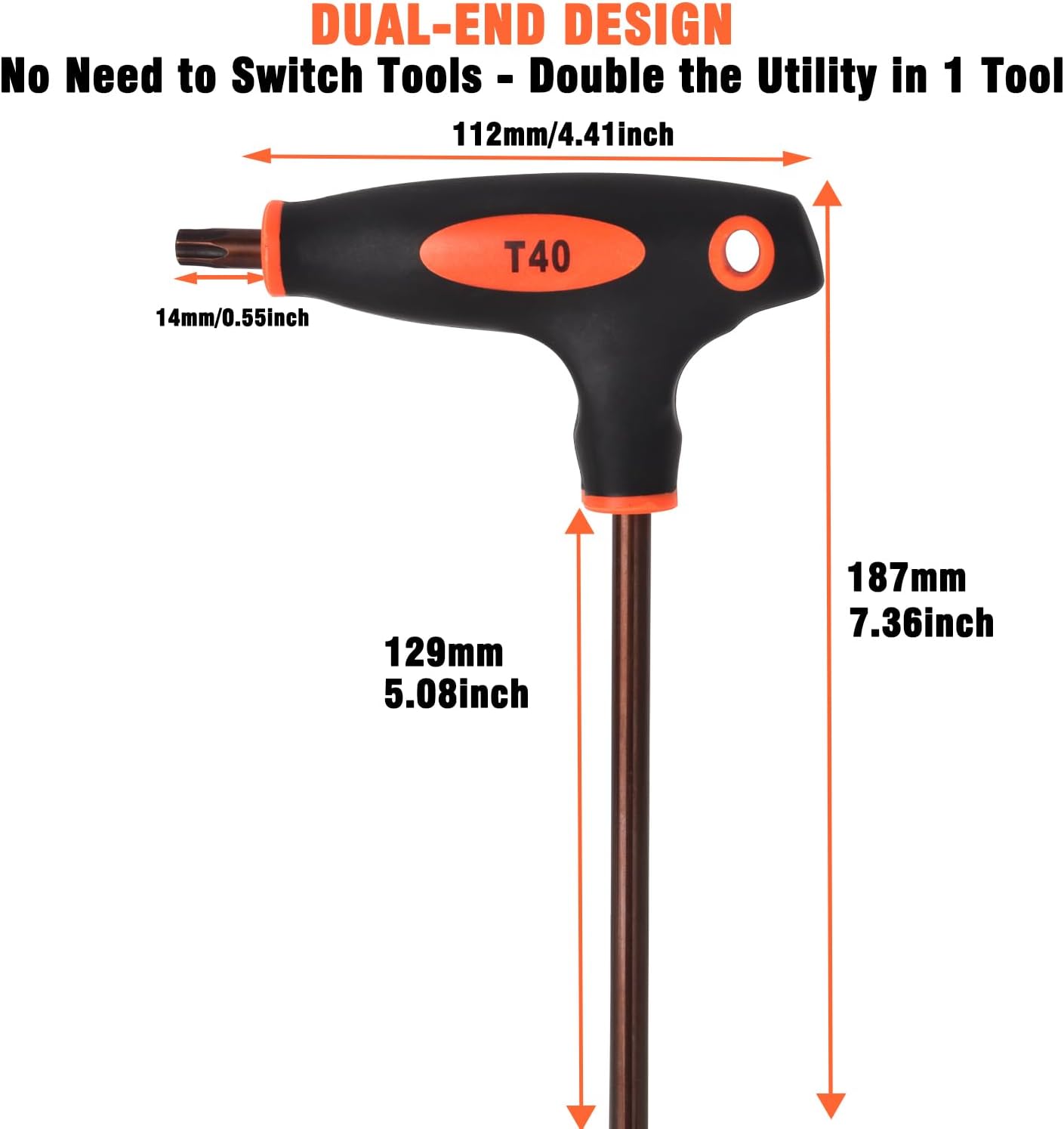 - ERGONOMIC T-HANDLE & DUAL-END DESIGN: Comfort-grip handle delivers maximum torque with less hand fatigue. Long arm (129mm/5.08") for extended reach & short arm for high leverage in confined spaces.